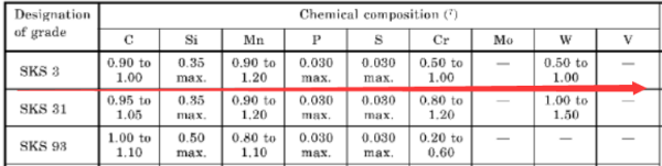 SKS3屬于日標(biāo)高硬度空冷淬硬高鉻工具鋼,執(zhí)行標(biāo)準(zhǔn):JIS G4404-2006